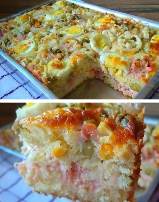 Tiene una masa suave tipo bizcochuelo salado y un relleno colorido lleno de vegetales, queso y mucho sabor.